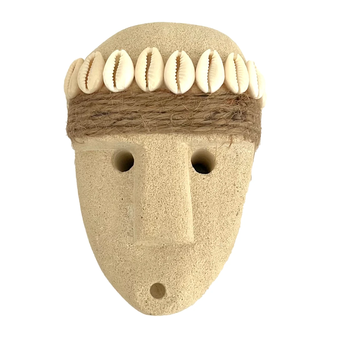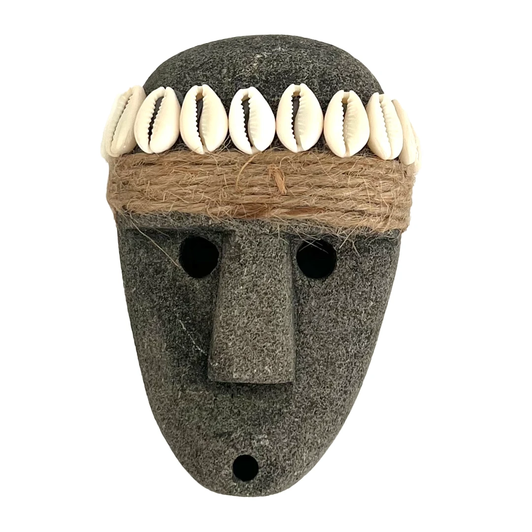 Hand carved 4.5″ sandstone mask from the island of Sumba. Traditionally, these statues are placed in and around the home to provide protection and healing for the occupants.