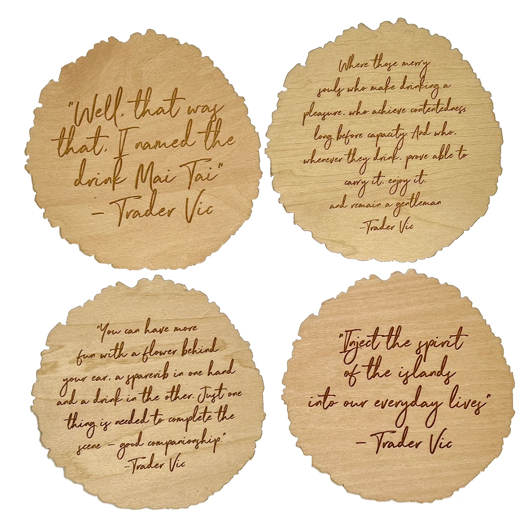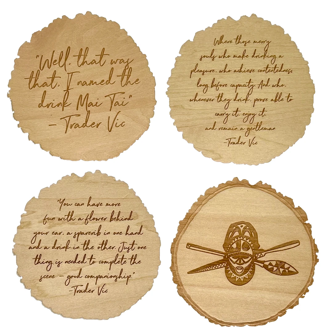 Made from real wood, this set of 4, live edge double sided coasters have our Shield and Oars laser engraved on one side and four famous quotes from Trader Vic on the other.